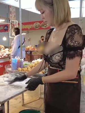 Ia menggunakan pakaian sedikit terbuka, rambut blonde, dengan aneka makanan penuh warna di gerainya. Tak heran gerainya ini selalu dipenuhi dan diantre banyak orang.